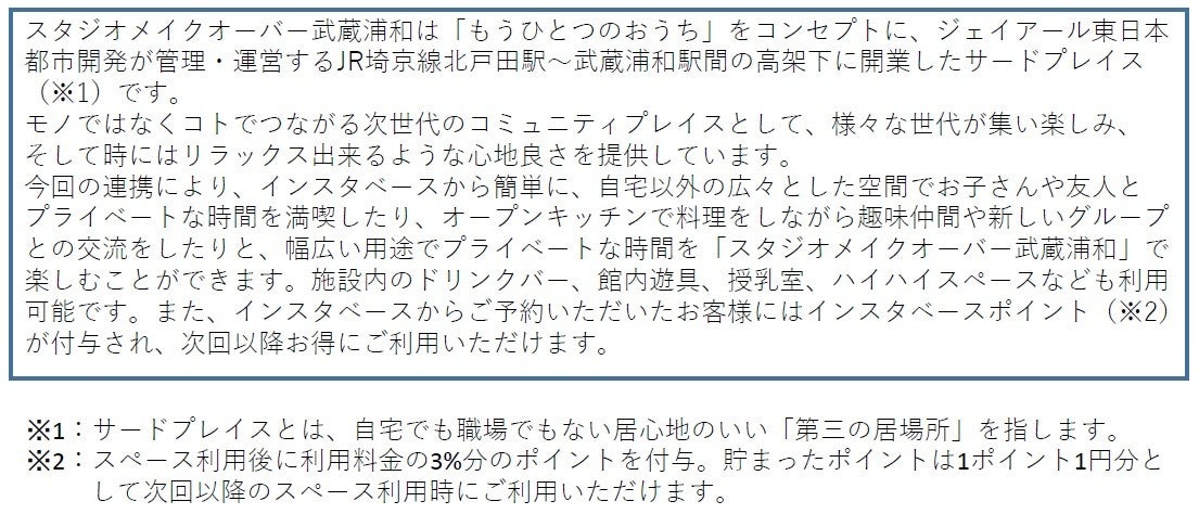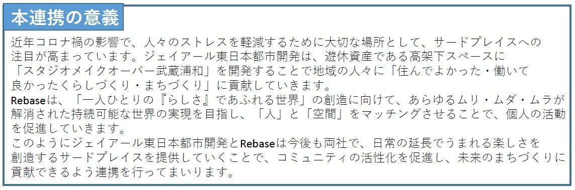 株式会社ジェイアール東日本都市開発(本社:東京都渋谷区、代表取締役社長:根本英紀、以下ジェイアール東日本都市開発)と、株式会社Rebase(本社:東京都渋谷区、代表取締役CEO:佐藤 海、以下Rebase)は、ライフスタイルをより豊かに、便利にするくらしづくり・まちづくりを目的に、第一段階としてジェイアール東日本都市開発が管理・運営する複合施設「スタジオメイクオーバー武蔵浦和」をレンタルスペースとして貸し出すことでサービス連携を開始いたします。