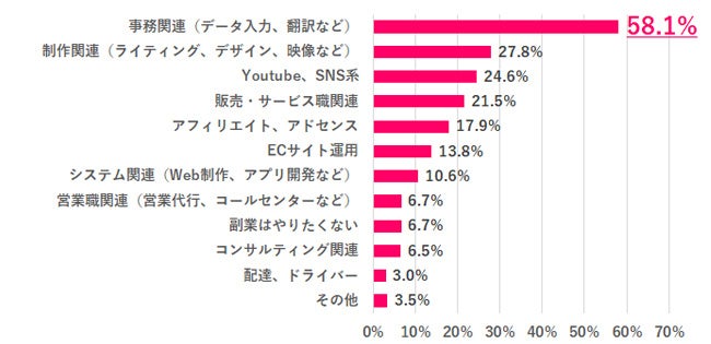 副業経験がない人に、今後やってみたい副業について聞いてみると、1位「事務関連(データ入力、翻訳など)」58.1%、2位「制作関連(ライティング、デザイン、映像など)」27.8%、3位「Youtube、SNS系」24.6%となりました。Q.2「どのような副業をやったことがありますか?」で1位に挙がっていた「販売・サービス職関連」は4位になっているものの、その他の順位はほとんど変わらず在宅でできる副業が人気なようです。