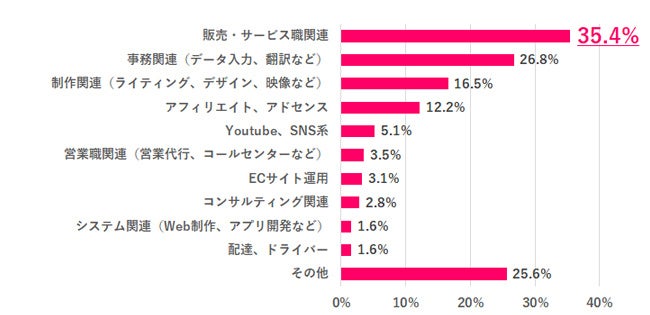副業をやったことがある人に、どのような副業をやったことがあるか聞いてみると、最も多かったのは「販売・サービス職関連」35.4%でした。2位以降は「事務関連(データ入力、翻訳など)、「制作関連(ライティング、デザイン、映像など)」、「アフィリエイト、アドセンス」など在宅でできる副業が目立ちます。