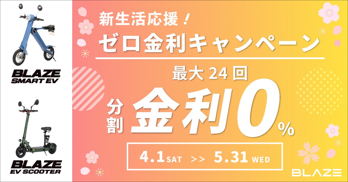 株式会社ブレイズ(愛知県名古屋市、代表取締役:市川秀幸、以下ブレイズ)は、令和5年4月1日(土)から5月31日(水)の期間、電動バイク「ブレイズ スマートEV」または「ブレイズ EVスクーター」をローンでご購入のお客様に対して、利息分をブレイズが負担する「ゼロ金利キャンペーン」を実施いたします。