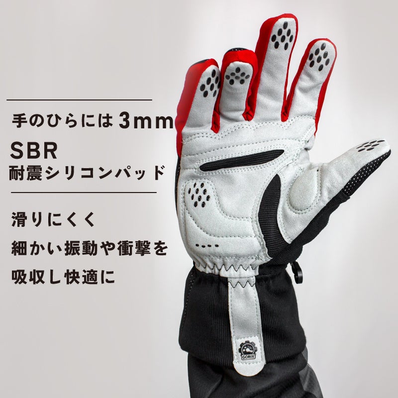 防水・防風性が高いので雨や雪のなかでも暖かさを維持。手の平には3mmのSBR耐震シリコンパッドを採用し、ハンドルからの細かい振動や衝撃を吸収し、長時間の走行もストレスを受けません。