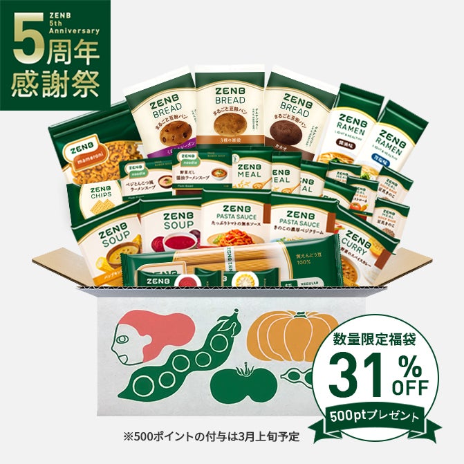 ZENBの人気商品を詰め合わせた最大31%OFFのオトクな福袋を販売します。定期オトク便をご利用中の方には、さらにオトクな53%OFFの特別福袋も販売予定です。詳細は、ZENB公式サイトからのお知らせメールやLINEでご案内します。