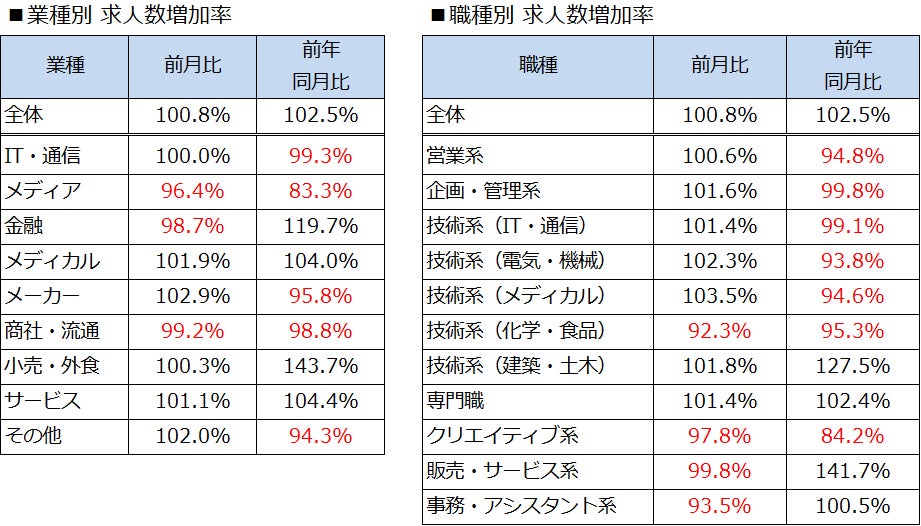 2020年3月の転職求人倍率は、前月比+0.02ポイントの2.54倍となりました。求人数は前月比100.8%、前年同月比102.5%となりました。転職希望者数は前月比100.4%、前年同月比106.1%でした。業種別では、「その他」を除く8業種のうち「IT・通信」「メディカル」「メーカー」「小売・外食」「サービス」の5業種で求人数が増加しました。求人の増加率が特に高かったのは、「メーカー」(前月比102.9%)、「メディカル」(前月比101.9%)でした。職種別では、11職種のうち「技術系(化学・食品)」「クリエイティブ系」「販売・サービス系」「事務・アシスタント系」を除く7職種で求人数が増加しました。求人の増加率が特に高かったのは、「技術系(メディカル)」(前月比103.5%)、「技術系(電気・機械)」(前月比102.3%)でした。