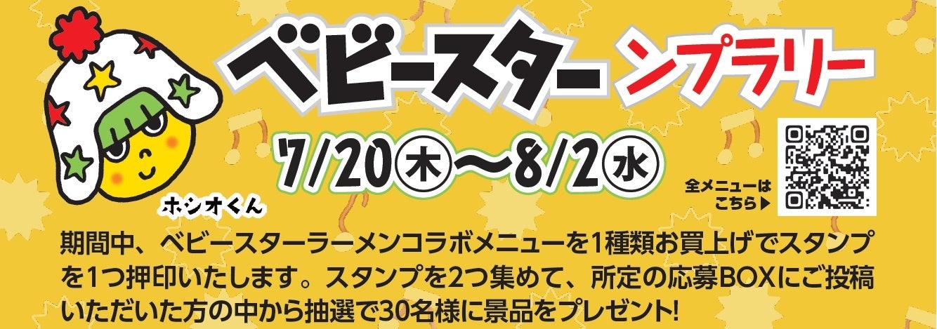2023年7月20日(木)から8月2日(水)の期間、食品フロア考案のベビースターラーメンを使ったコラボメニュー計12種類を展開します。さらに、スタンプラリーやベビースターの個性的なカタチを活かした「麺文字」体験ワークショップなど親子で楽しめるイベントも同時開催。ベビースターを体感できる特別な2週間をお届けします。