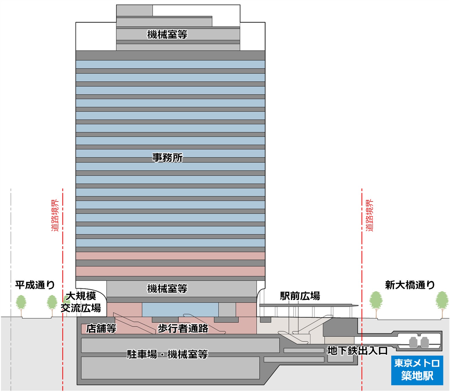 本事業は、こうした築地地区における先行プロジェクトとして、地下鉄駅を起点とした歩⾏者ネットワークおよびまちの活気と魅⼒を⾼めるにぎわい交流空間を形成します。また、現在の築地地区では希少な、駅直結かつ基準階500坪超のオフィス空間を整備することで、周辺地域の業務機能の向上に貢献していきます。