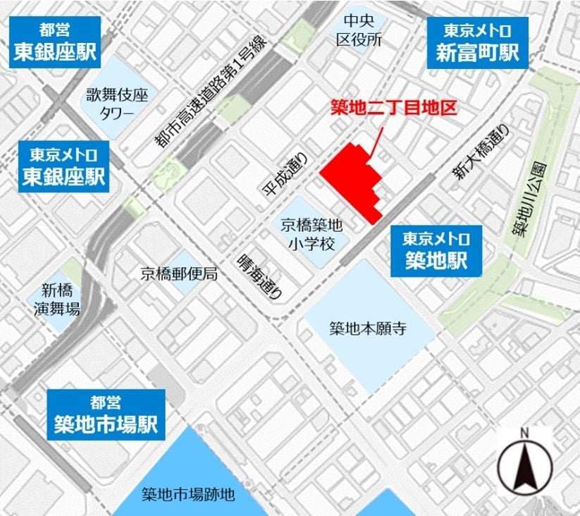 本事業は、築地本願寺や中央区立京橋築地小学校の近隣、東京メトロ日比谷線「築地」駅に隣接する約0.6haの区域において、区域内の既存ビルを解体し、築地駅に直結する新たなオフィス・商業施設等が入居するビルを建設する再開発事業です。