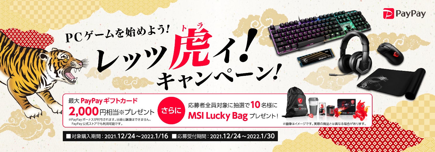 この度、エムエスアイコンピュータージャパン株式会社は、2021年12月24日(金)から2022年1月16日(日)までの期間で、対象の製品をご購入いただいた先着200名様に最大2,000円分のPayPayギフトカードをプレゼントする「PCゲームを始めよう!レッツ虎イ!キャンペーン」を開催いたします。