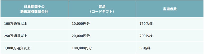 対象期間中にエントリーされ、かつ『外貨ネクストネオ』で通貨ペア・取引チャネル等を問わず以下の条件でお取引をされたお客様の中から、合計で1,000名様に最大10万円相当の美味しいグルメギフトをプレゼントいたします。