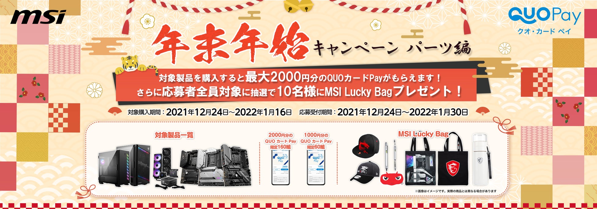 この度、エムエスアイコンピュータージャパン株式会社は、2021年12月24日(金)から2022年1月16日(日)の期間に、「年末年始キャンペーン パーツ編」を実施します。本キャンペーンは、指定のMSI製品を購入した方の中から先着で最大2,000円分のQUOカードPayをプレゼントいたします。さらに、抽選で10名様に、非売品のMSIオリジナルノベルティグッズをセットにした幸運の”Lucky” Bagをプレゼントいたします。