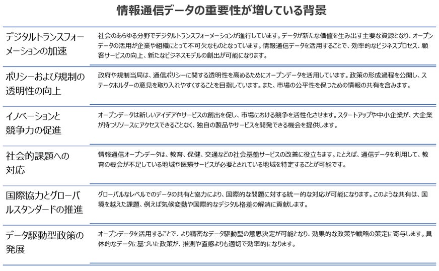 これらの特性により、情報通信分野のオープンデータは、技術革新、市場分析、政策策定、社会問題の解決など、多方面にわたる用途に利用されています。