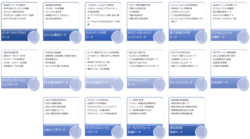 データ: インターネット利用統計, モバイルデータ消費量, ソーシャルメディア利用動向, 電子商取引の売上データ, デジタル広告の効果
