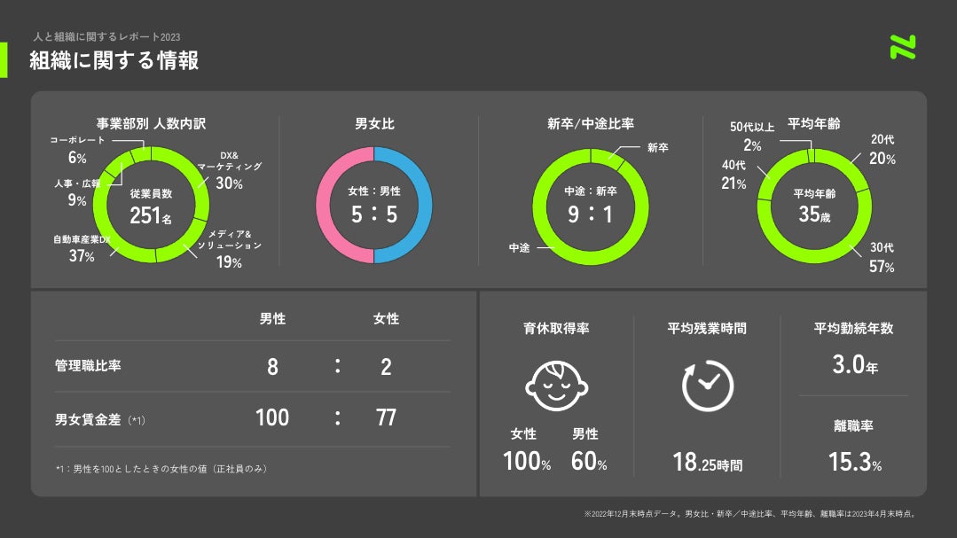詳細な情報を可視化・開示することで、採用候補者のみなさまとの情報の非対称性を解消し、正しい実態を知っていただき、深い理解によるマッチングを図りたいと考えています。