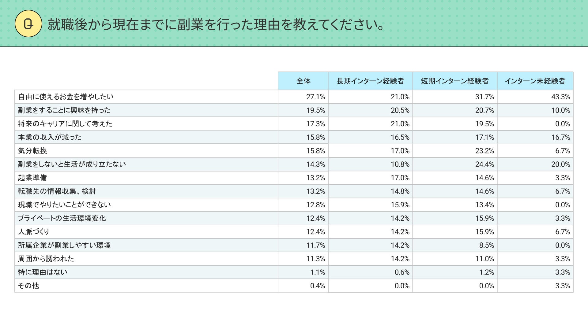 また、学生時代のインターン経験の有無別でみたところ、インターン経験者のほうが経済的な理由での副業実施割合は低く、特に長期インターン経験者では自身のキャリアや起業準備などの理由の比率が高い傾向となりました。