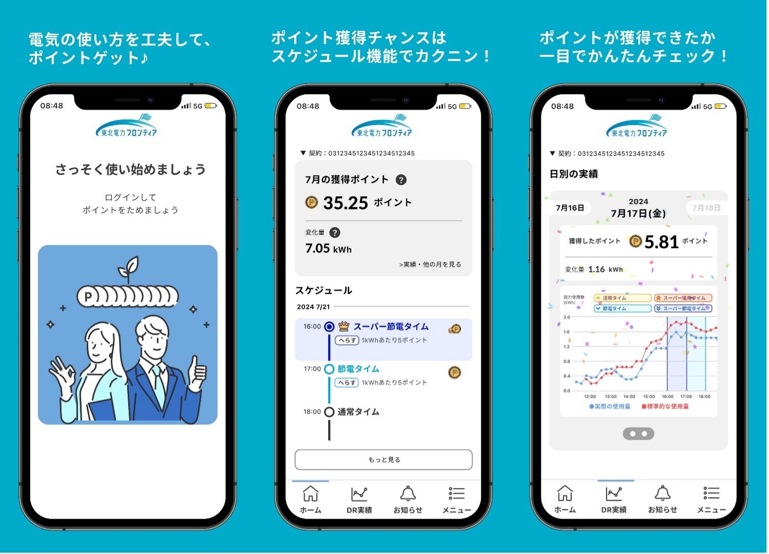 ベースライン(標準的な使用量)と実際の使用量を比較したグラフや獲得したポイント、DR発動の予定など、必要な情報はアプリで確認ができます。