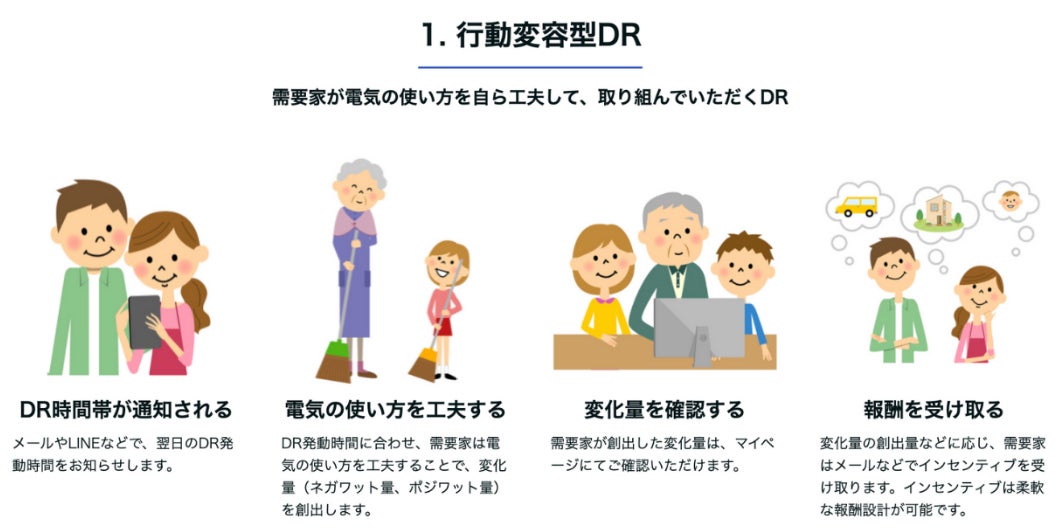 「エネチェンジクラウド DR」は、デジタル式電力量計スマートメーターで取得できる電力データを活用し、低圧・高圧向けに電力消費のピークシフトを促すサービスで、参加者の節電協力によって電力需給ひっ迫を解消する取り組みです。参加者の自発的な節電行動を促す「行動変容型DR」と、スマートデバイスにあらかじめ接続した電化製品の遠隔制御を行う「スマートデバイス型DR」の2つを提供しています。節電協力を要請する時間帯は、電力市場(JEPX)で前日に公開される翌日のエリアプライスをもとに、あらかじめ設定したしきい値、および特定時間帯の指定により設定されます。参加者は個々の標準的な電力使用量から節電行動によりシフトした電力量に応じて特典を受け取ることができます。