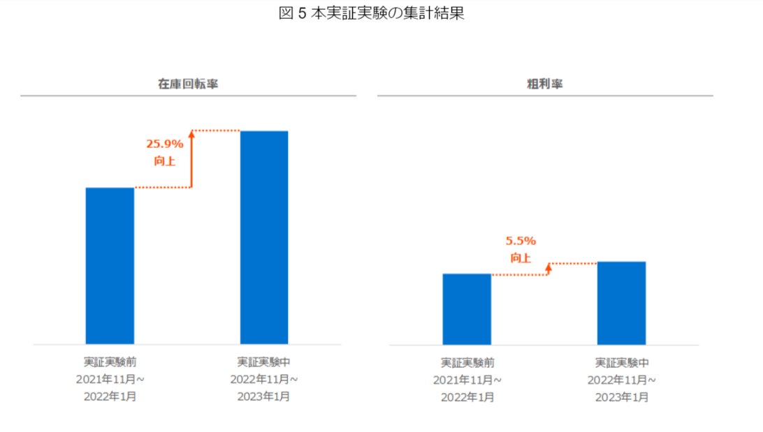 そこで本実証実験では、在庫回転率(売り切り期間)および粗利率について、ダイナミックプライシングの導入前と導入期間とでの比較を行うことで、売り切り促進の効率と効果を検証しました。