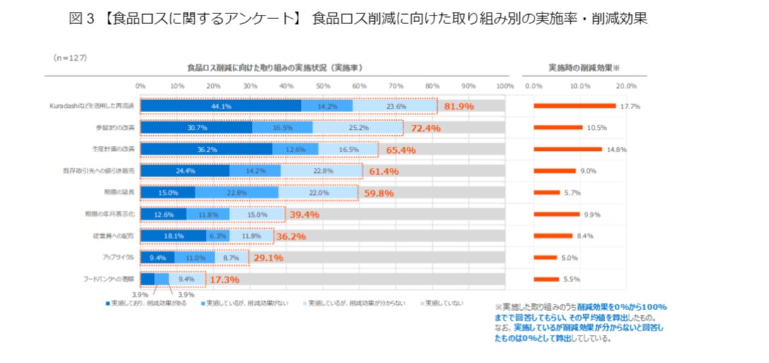 食品ロス削減に向けた取り組みのうち、「Kuradashiなどを活用した再流通」「歩留まりの改善」「生産計画の改善」「既存取引先への値引き販売」「消費期限の延長」の5つの実施率が50%を超えました(図3)(注4)。