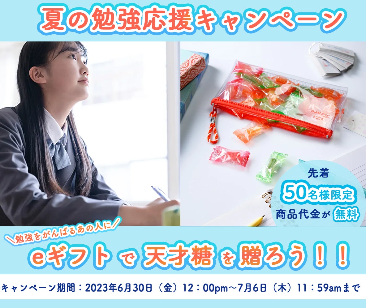 このたび、受験生にとって重要な時期の夏休みを前に、夢や目標にむかって頑張る友達や家族にエールを贈ってほしいという想いから「夏の勉強応援キャンペーン」をスタートします。プレゼントキャンペーンとして、先着50名様限定で天才糖をeギフトで購入いただいた場合、天才糖の商品代金が無料となります。また、ご注文者(応募者)の方には次回Kanro POCKeTで使えるクーポンをプレゼントいたします。あわせて、同キャンペーン期間中限定で天才糖2袋セットを30%OFFの価格で販売いたします。勉強を頑張っている友達や家族にエールを込めて天才糖を贈ってください。