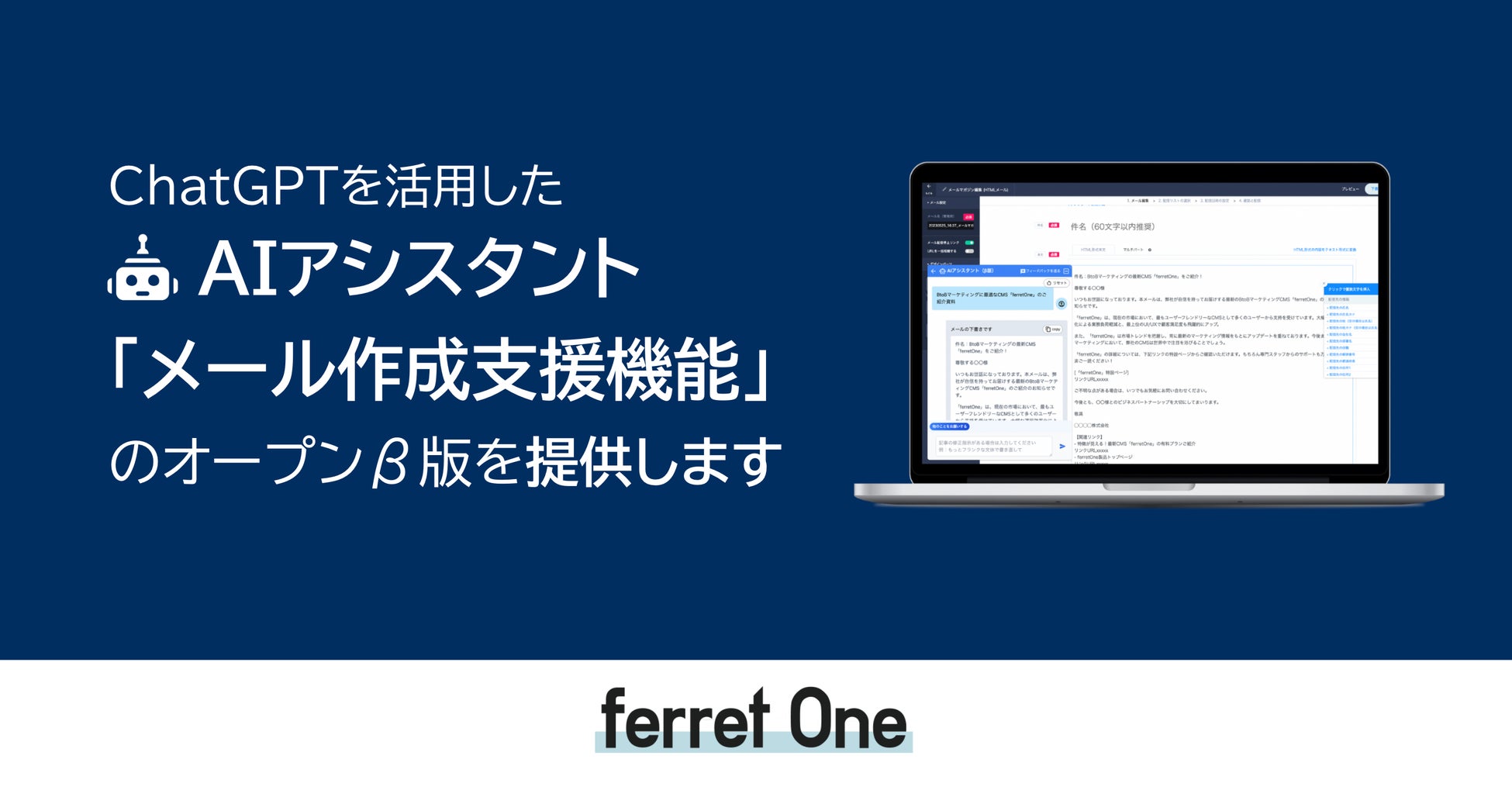 そこで、学習コストと業務負荷の低いマーケティングツールを目指す『ferret One』は、『ChatGPT』を活用し、企業のメールマーケティング業務を支援する「メール作成支援機能」の提供を開始する運びとなりました。