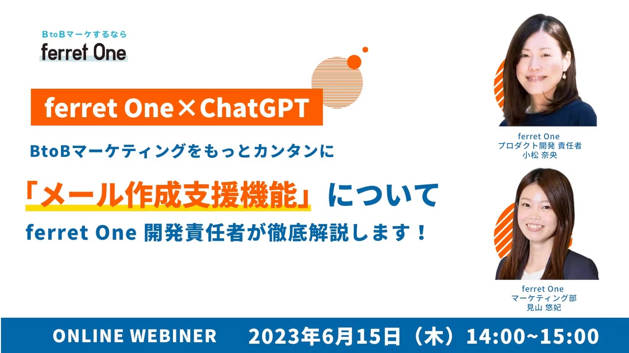 『ChatGPT』を活用したBtoBマーケティング活動における生産性向上テーマに興味があるマーケティング担当者を対象に、『ferret One』のマーケティング部の見山と、プロダクト開発責任者を務める小松が、「ChatGPTを活用した生産性向上事例」「効果的なメールマーケティング施策とは?」「どれだけカンタンになる?第2弾 “メール作成支援機能”の概要」について解説いたします。
