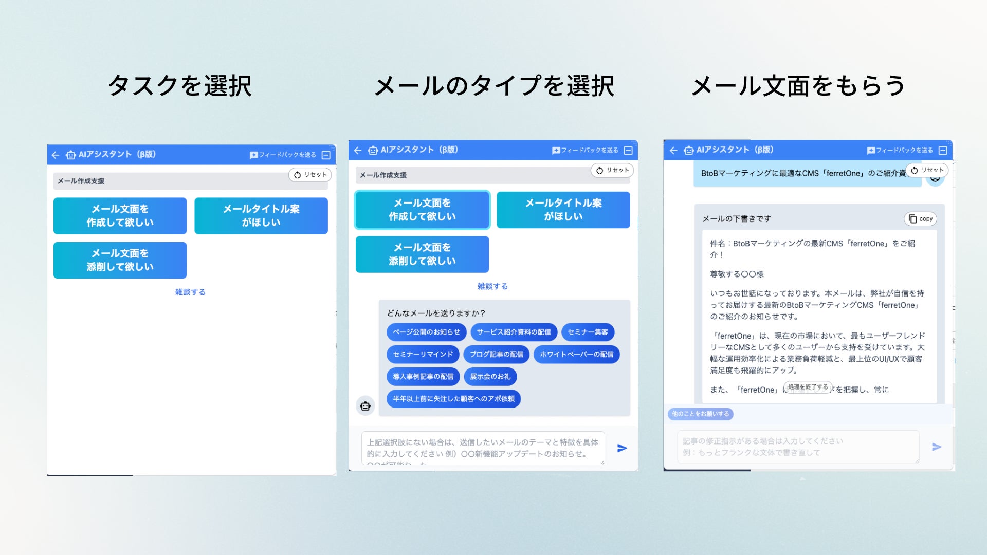 「メール作成支援機能」では、AIアシスタントに3つのタスクを簡単に依頼できます。