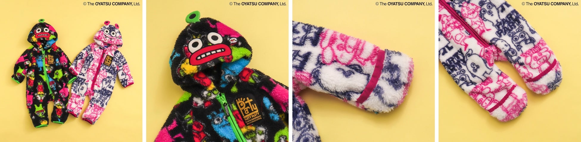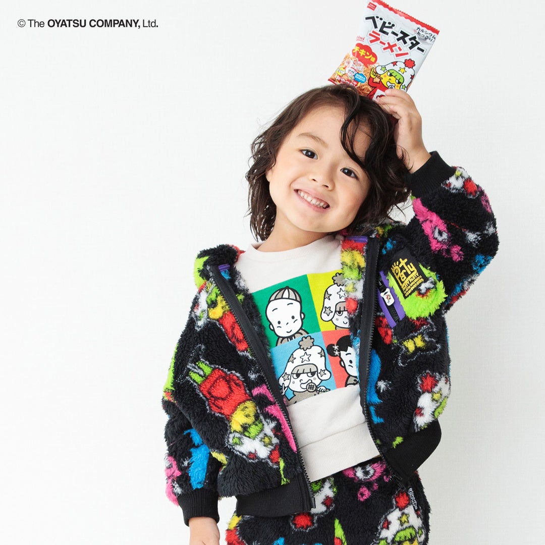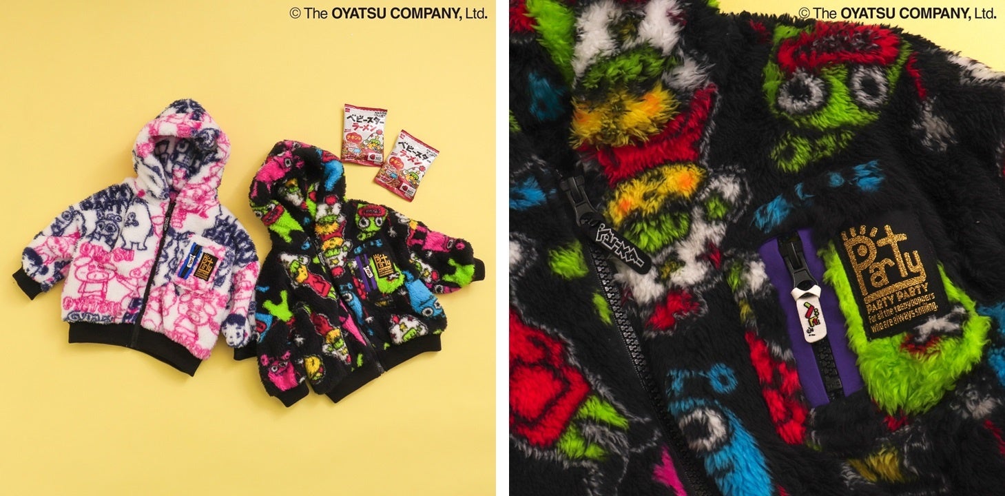 「PARTYPARTY」で不動の人気を誇ったフリースパーカーが、おやつカンパニーのキャラクター達とともに復活しました!往年のPARTYPARTYタグにプラスして、ファスナータグには「ベビースター」のロゴ入り!コラボならではの贅沢な仕上がりとなっています。