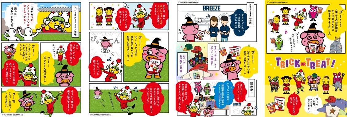 コラボアイテムの販売に先立って、ベビースターやブタメン、「PARTY PARTY」のキャラクターたちが登場するオリジナルストーリーを描き起こし、BREEZE公式X(旧Twitter)にて投稿。ハロウィンに向けて、お好きなファッションアイテムを選ぶ楽しさとPARTYのようなワクワク・ドキドキ感を、「BREEZE」×「ベビースター」でお届けします。