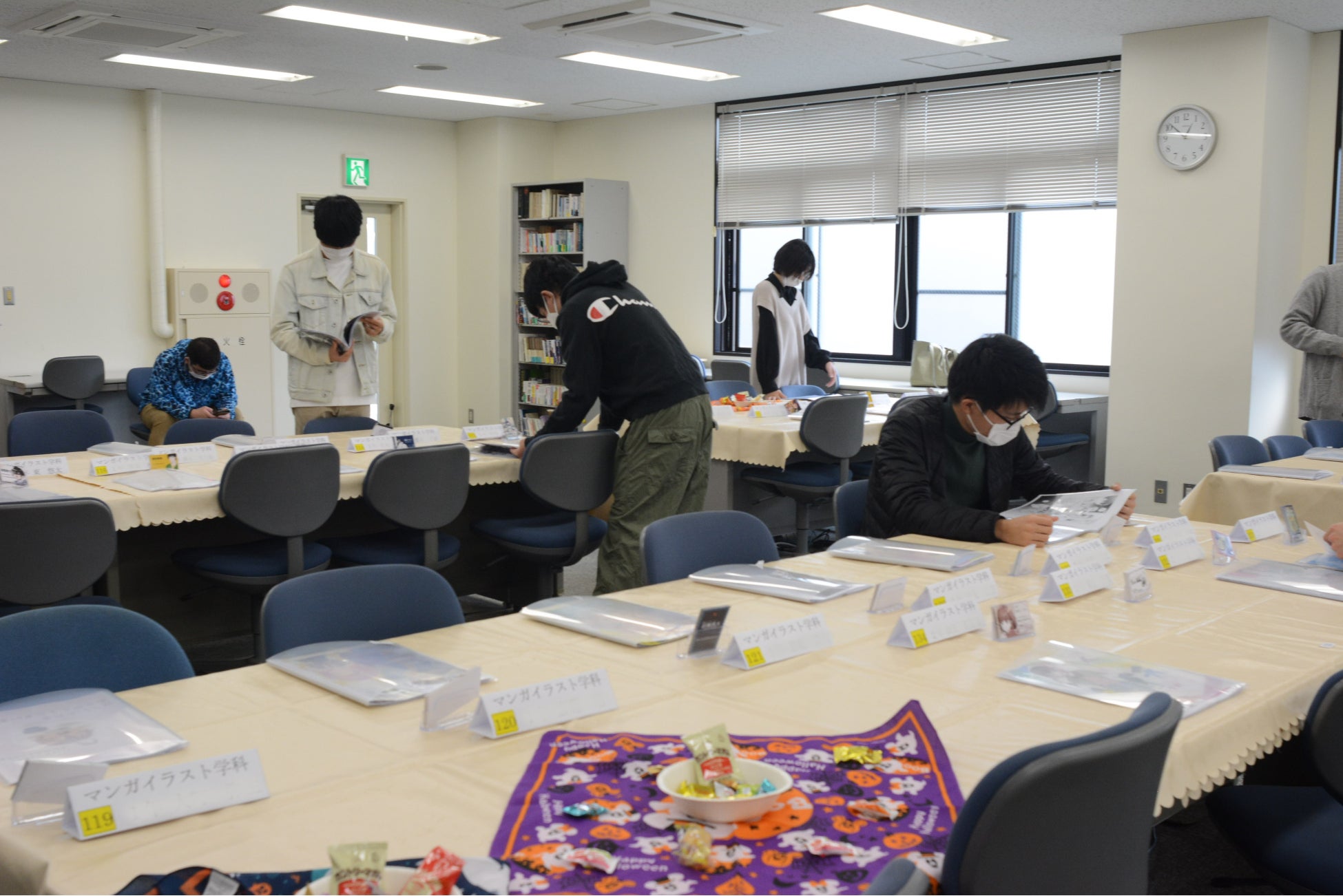 キャラクターデザイン学科の今年のイラスト制作のテーマは「異世界ジョブ」。ポートフォリオは、ゲーム業界希望者やグッズ業界希望者など、将来目指す職種ごとに並べられており、来場者の方からは「どれもどれも見応えのあるものばかりでした」という感想をいただきました。
