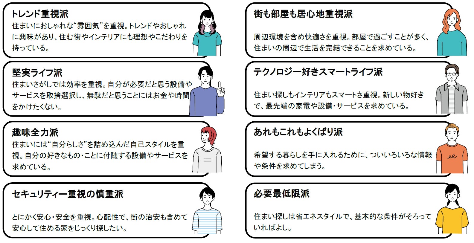 「理想とする住まい観」や「普段の生活意識」に関する質問をし、回答をもとに8つのタイプに分類。タイプ別に「求める住まいの周辺環境」の特徴を分析しました。