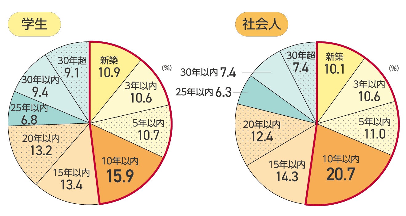 ・築年数は学生・社会人ともに約半数が「10年以内」