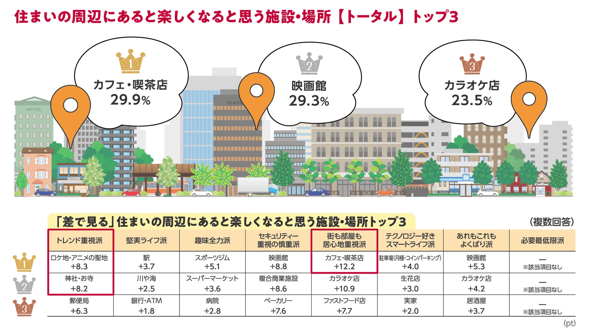住まいの周辺にあると楽しくなると思う施設・場所については、「カフェ・喫茶店」「映画館」「カラオケ店」がトップ3となりました。