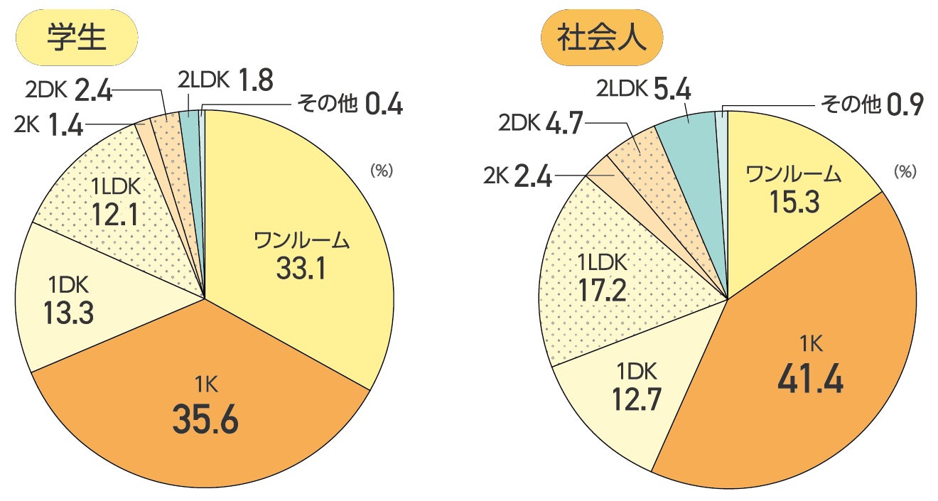 現在の部屋の間取りは、学生・社会人ともに「1K」がトップ