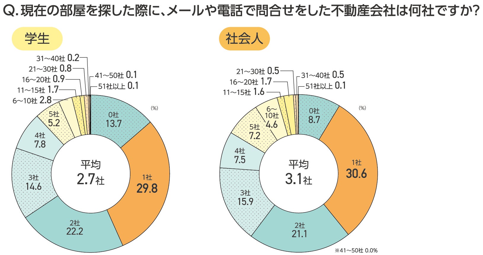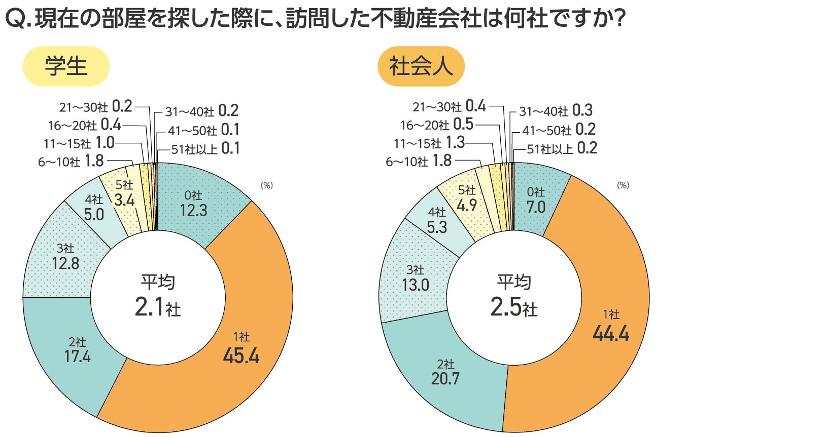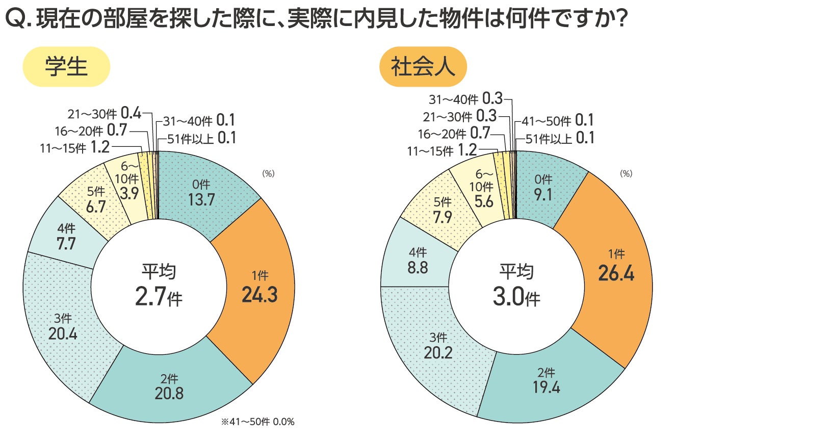 内見した平均物件数、学生は2.7件、社会人は3.0件