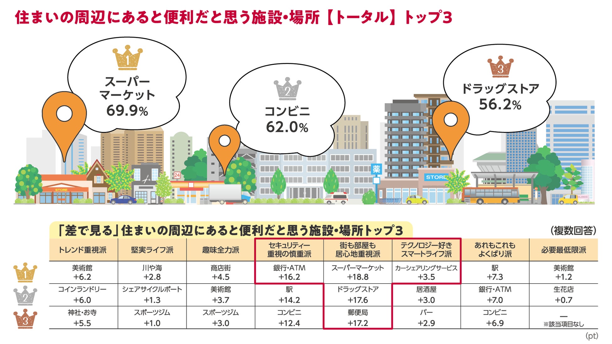 タイプ別に全体平均との差が大きいものを見ると、『街も部屋も居心地重視派』はトップ3が+17ポイント以上でそれぞれの施設・場所を特に重視しているようです。また、『セキュリティー重視の慎重派』は「銀行・ATM」を重視、『テクノロジー好きスマートライフ派』は「カーシェアリングサービス」を重視とそれぞれの特徴が見られました。