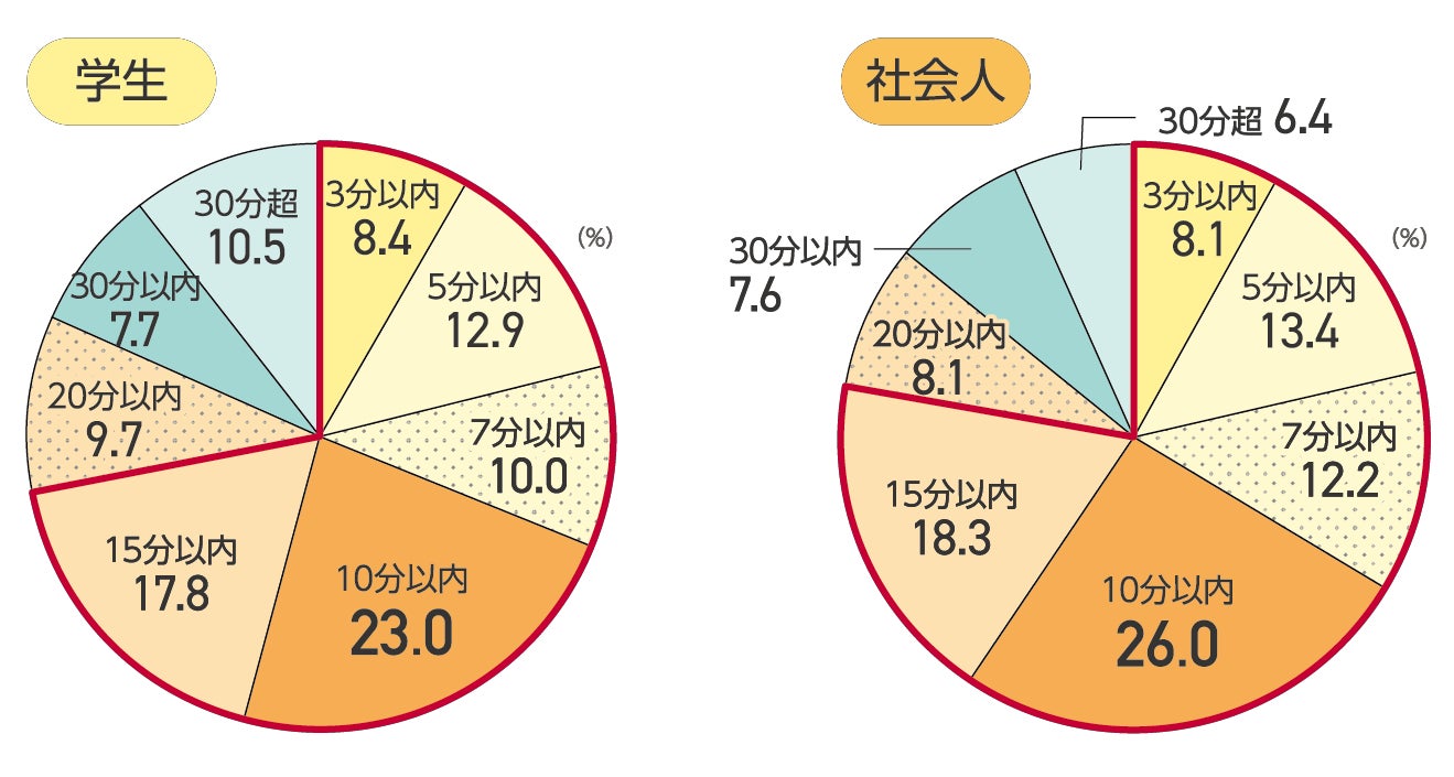 最寄り駅までの徒歩分数は、学生・社会人ともに半数以上が「10分以内」