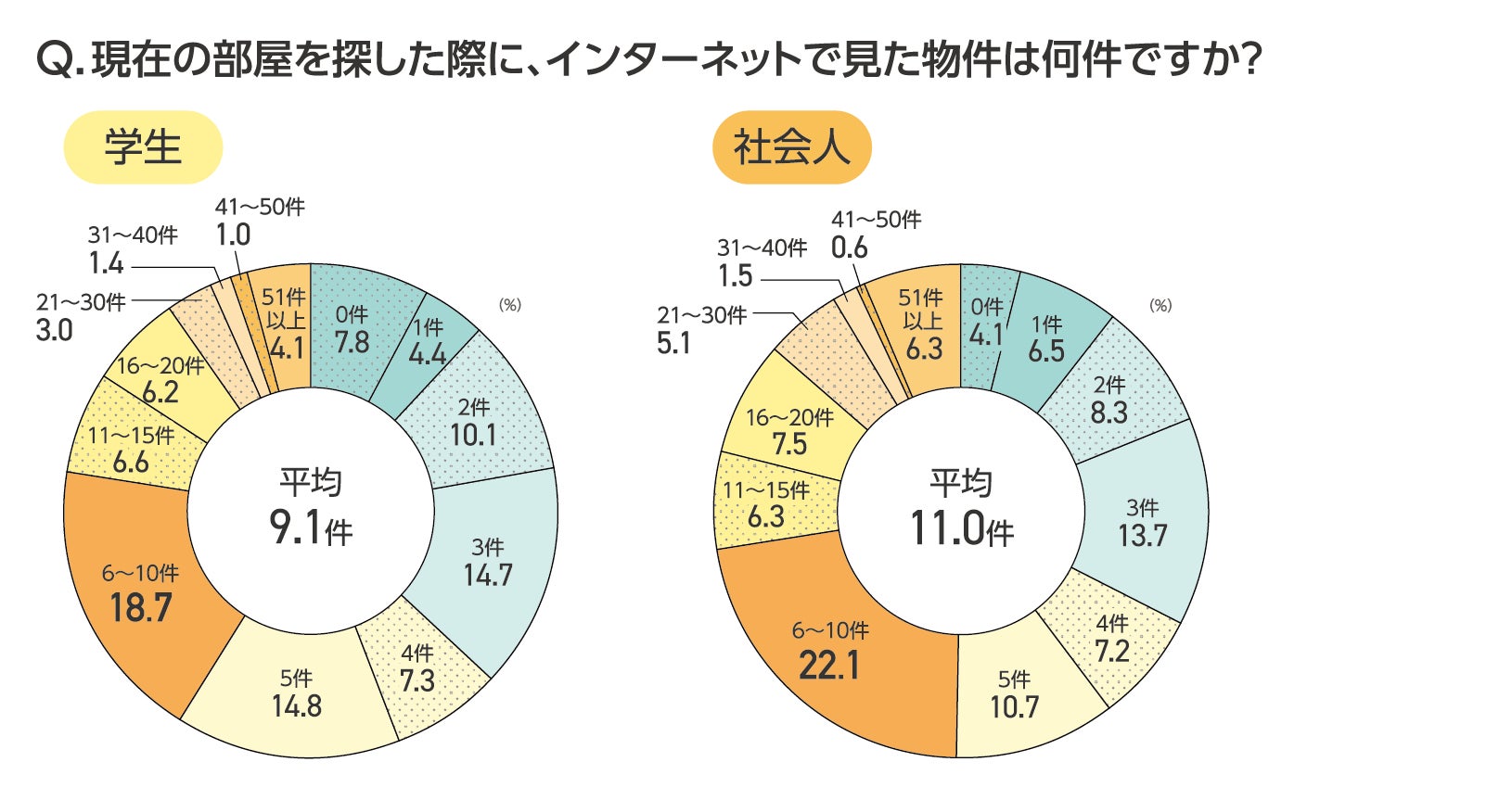 ・インターネットで見た平均物件数、学生は9.1件、社会人は11.0件