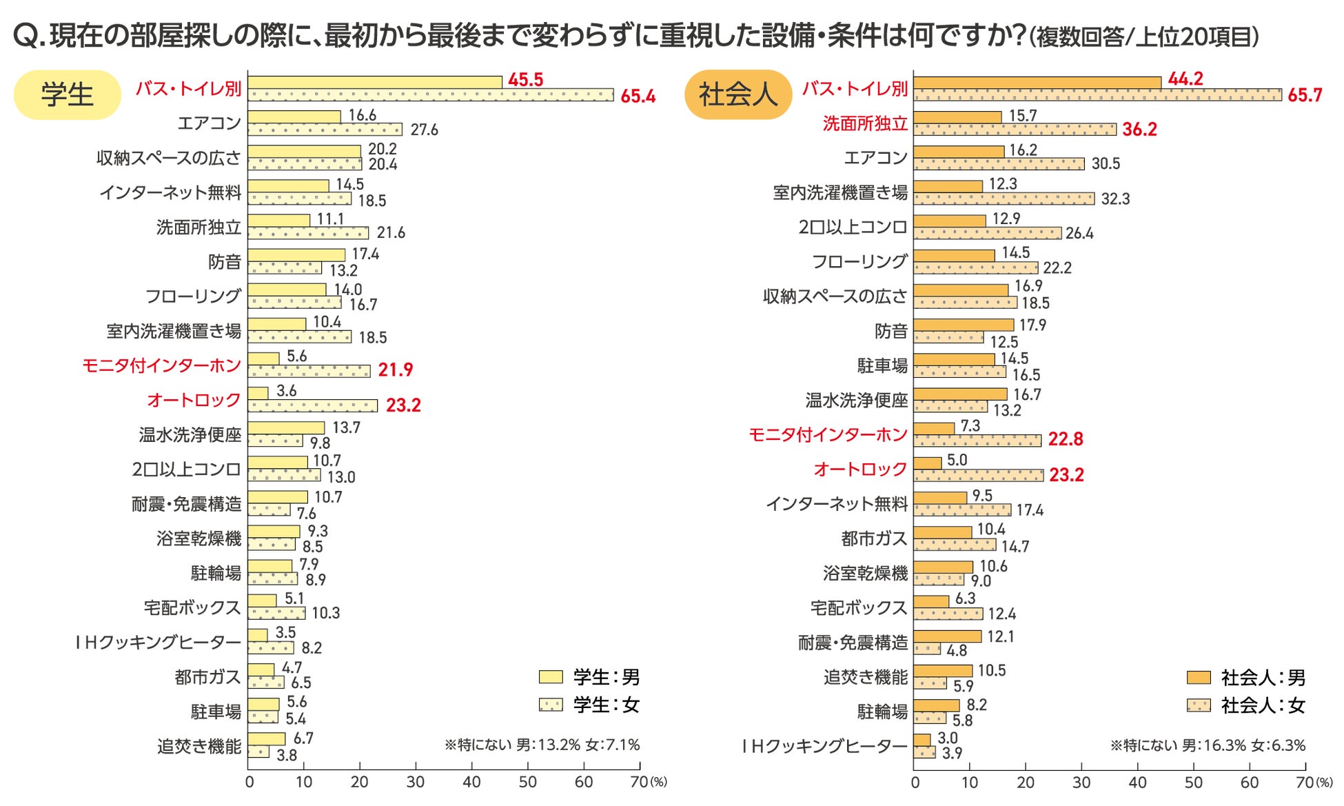最後まで重視した設備については、学生・社会人ともに「バス・トイレ別」が突出して高く、学生女性・社会人女性では65%以上となりました。学生女性・社会人女性は20%以上が「オートロック」や「モニタ付インターホン」といったセキュリティー設備を重視している一方、 学生男性・社会人男性は約5%と3~4倍の差が見られました。