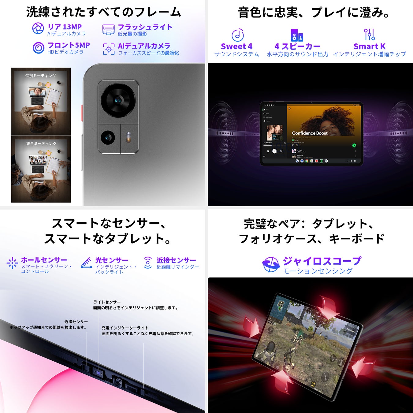Teclast「T60」は、日常的なスクリーンダイナミクスのための標準的な重力センサーを超え、先進的なジャイロスコープを導入しました。適用のゲームで、強める多彩なコントロールを体験し、その高精度で、衛星のないトンネルでも自信を持ってナビゲートできます。内蔵されたスマートセンサーに対応し、ケースの開閉に合わせて画面が自動的にウェイクアップまたはオフになります。