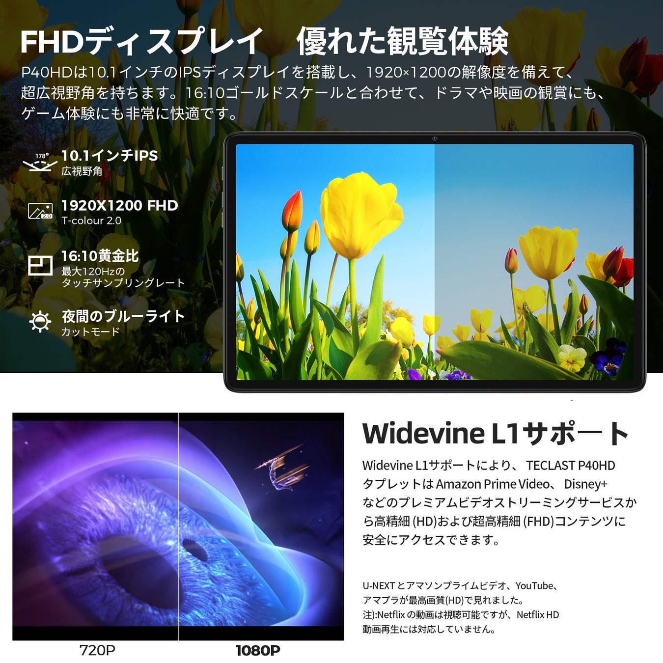 P40HDは新しい外観デザインコンセプトを採用し、信号オーバーフロービットを金属ボディの中に入れて、全体をより滑らかに仕上げました。10.1インチのIPSディスプレイを搭載し、1920×1200の解像度を備えて、超広視野角を持ちます。16:10ゴールドスケールと合わせて、ドラマや映画の観賞にも、ゲーム体験にも非常に快適です。ブルーライトカットモード、読書モードなどと一緒に使用することで、長時間使用しても疲れません。