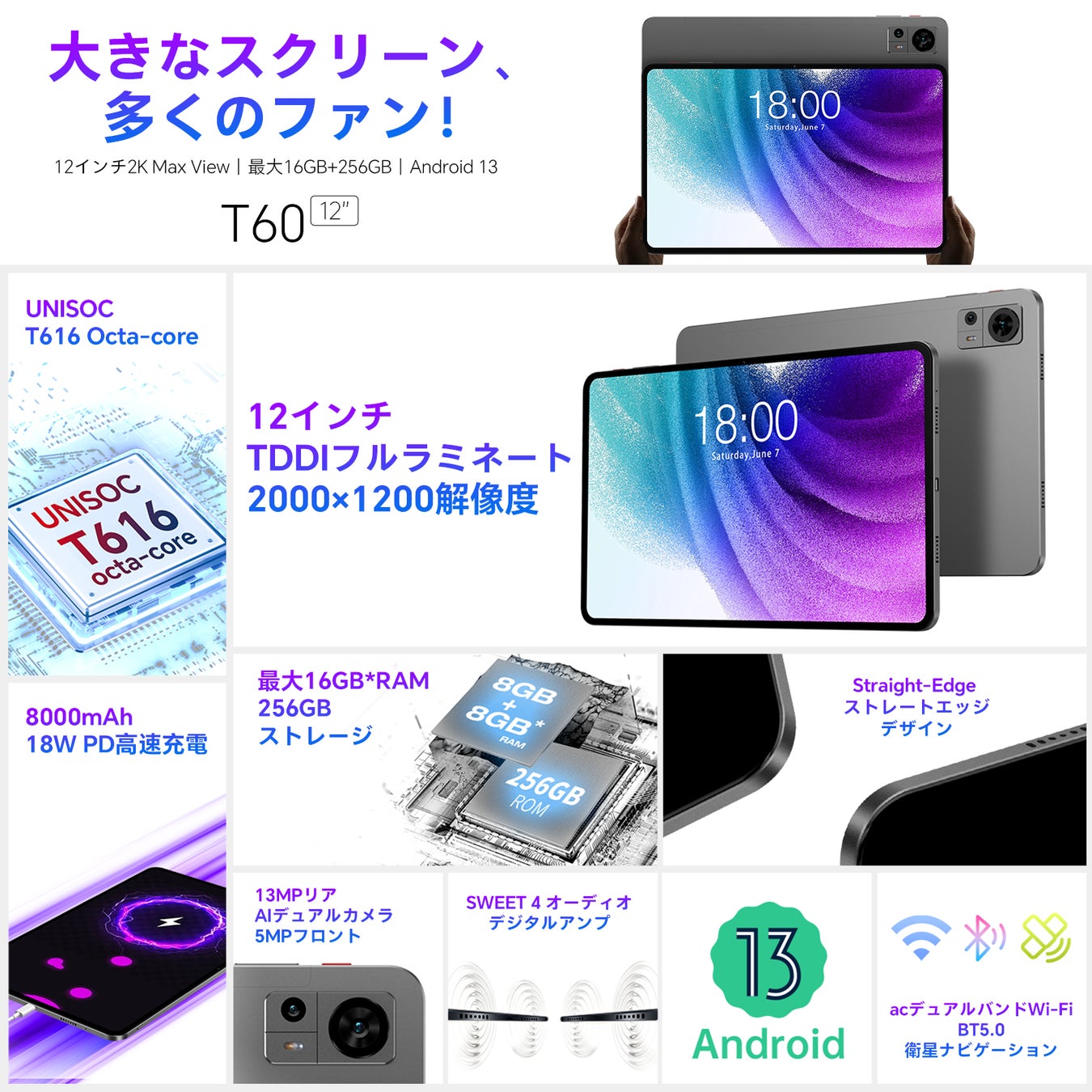 12インチ / Android 13 / 16GB+256GB+1TB TF拡張 / 2K IPSディスプレイ / 4G LTE+5G WiFiモデル / Widevine L1対応 / 18W PD急速充電+8000mAh / GPS機能サポート