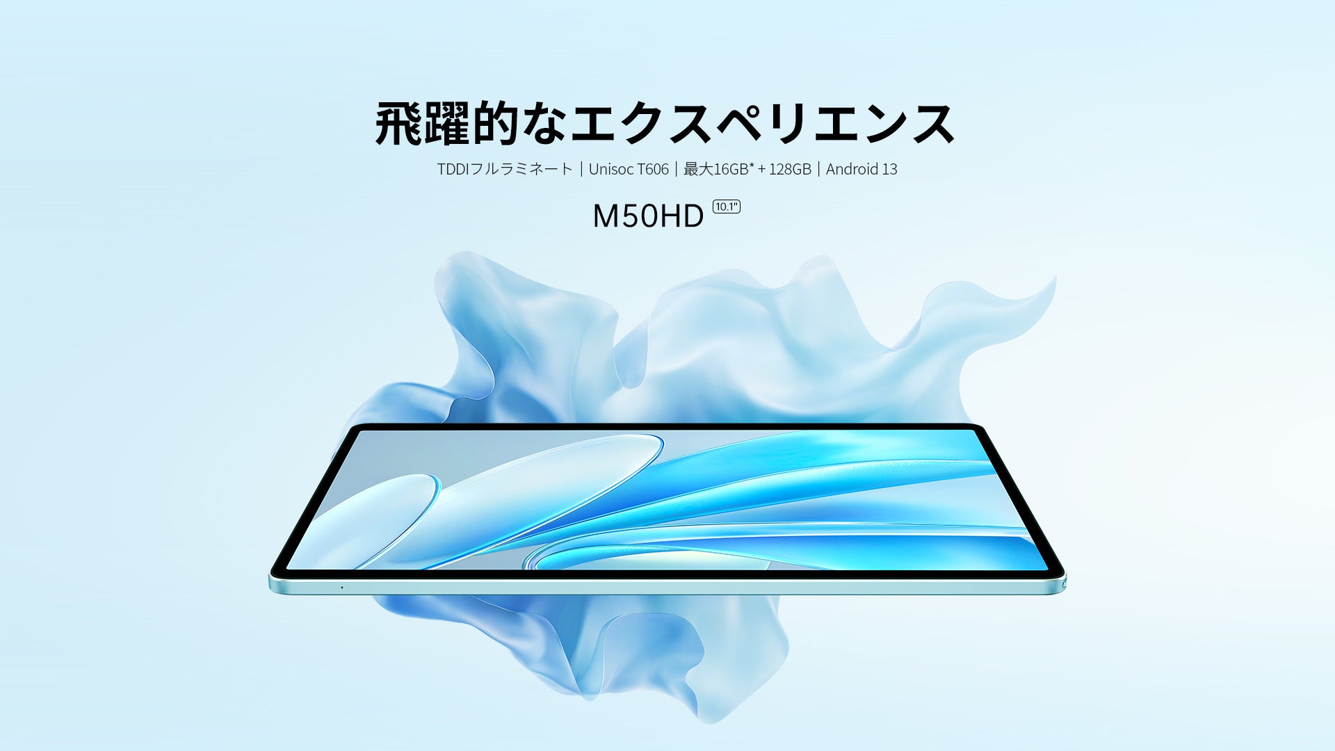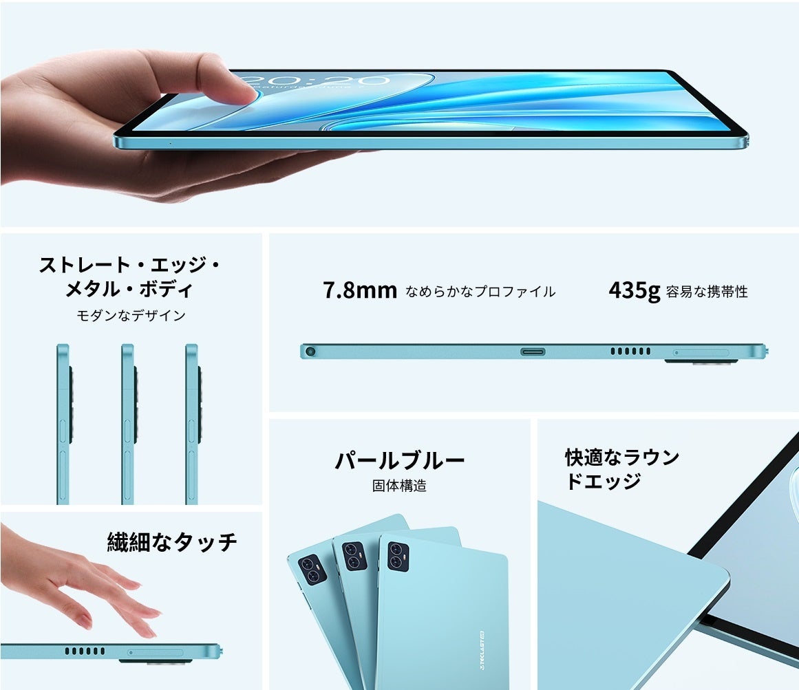 Teclast M50HDは10.1インチのフルラミネートフルHDスクリーンを搭載。消費電力と性能のバランスが取れたUnisocT606オクタコアプロセッサを搭載し、8GBのRAMと128GBのストレージを備えています。外観の美しさと内部のパワーのバランスが取れています。IPSディスプレイを搭載し、画面対ボディ比は最大83%、解像度は1920×1200のフルHDで、息をのむような視覚体験を提供します。洗練されたパールブルーのカラーパレットを採用し、わずか7.8mmの薄さと約435gの軽量なストレートエッジのメタルデザインによって引き立てられています。