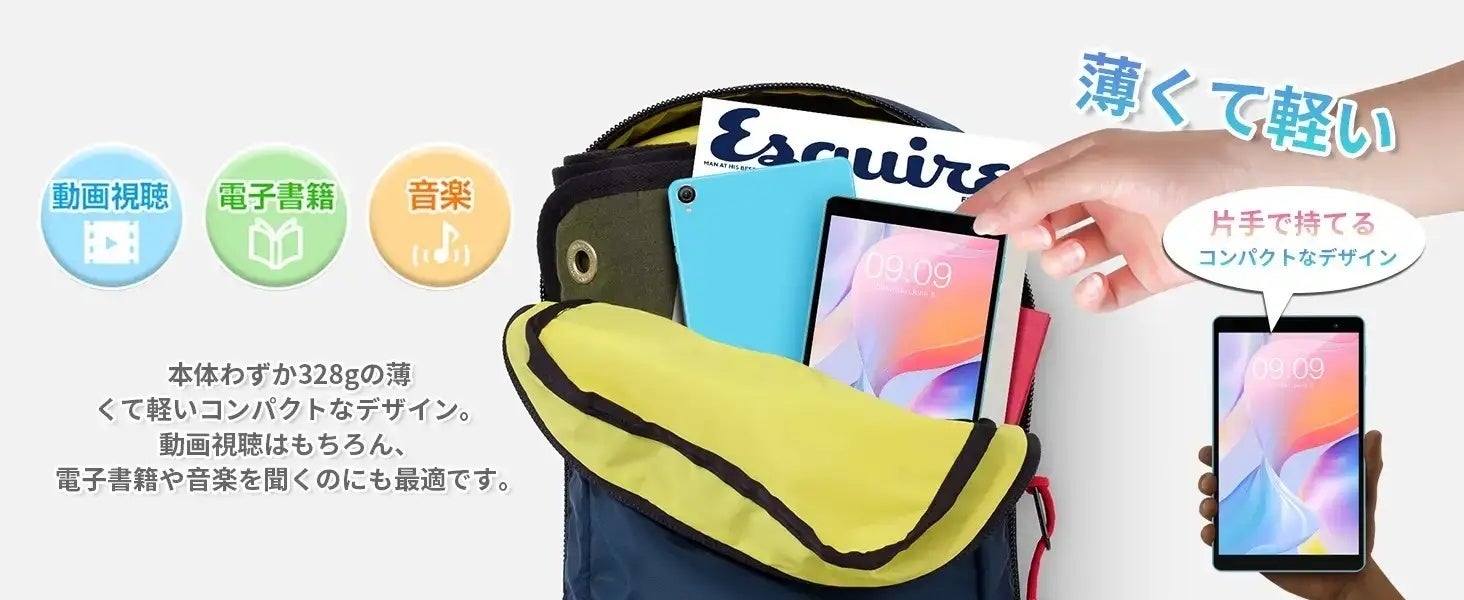 Teclast「P80T」は、8インチのコンパクトさに超薄型の6mmベゼルを設計、簡単に片手で取り扱う可能です。重量は約310gで、軽量でポータブルです。鮮やかなアクアブルーデザインを採用し、厳選された色で仕上げて、野外使用時明るくて注目、魅力で個性です。