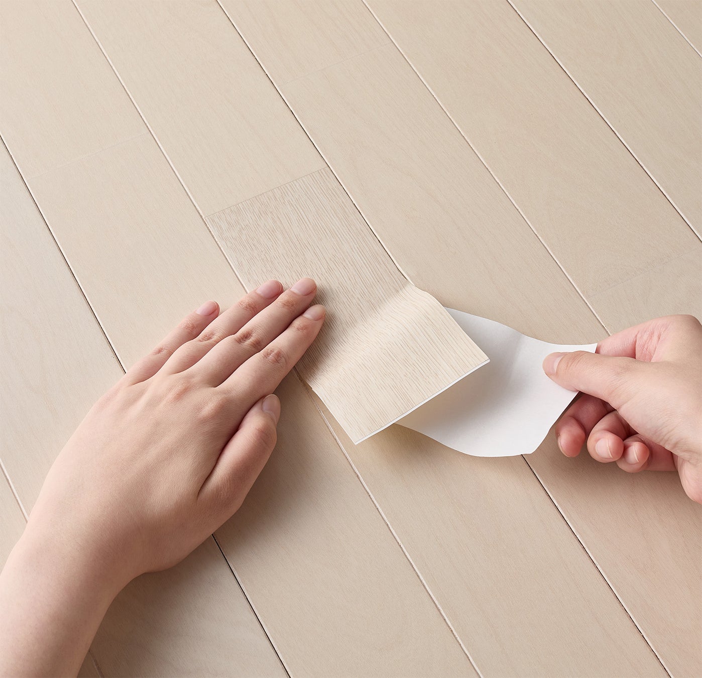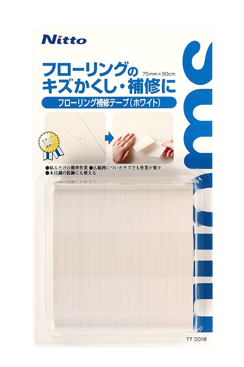 『フローリング補修テープ』の使い方は簡単で、テープをキズの大きさに合わせてカットして貼るだけです。本製品は、幅広のテープで床材を覆うため、パテでは補修しづらい広範囲のけずれや、補修用クレヨンでは対処しづらいカケやへこみなど、さまざまな種類のキズに対応可能です。また、フローリングを清潔で光沢のある状態に保つためのワックスやつや出し剤、洗浄シートなどもテープの上から使用できます。