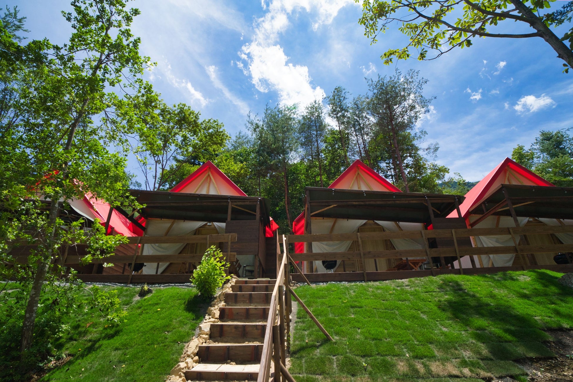 木々の緑に赤いテントの屋根が映えるウッドデザインパーク与位は、兵庫県第2の面積を誇り、さらに