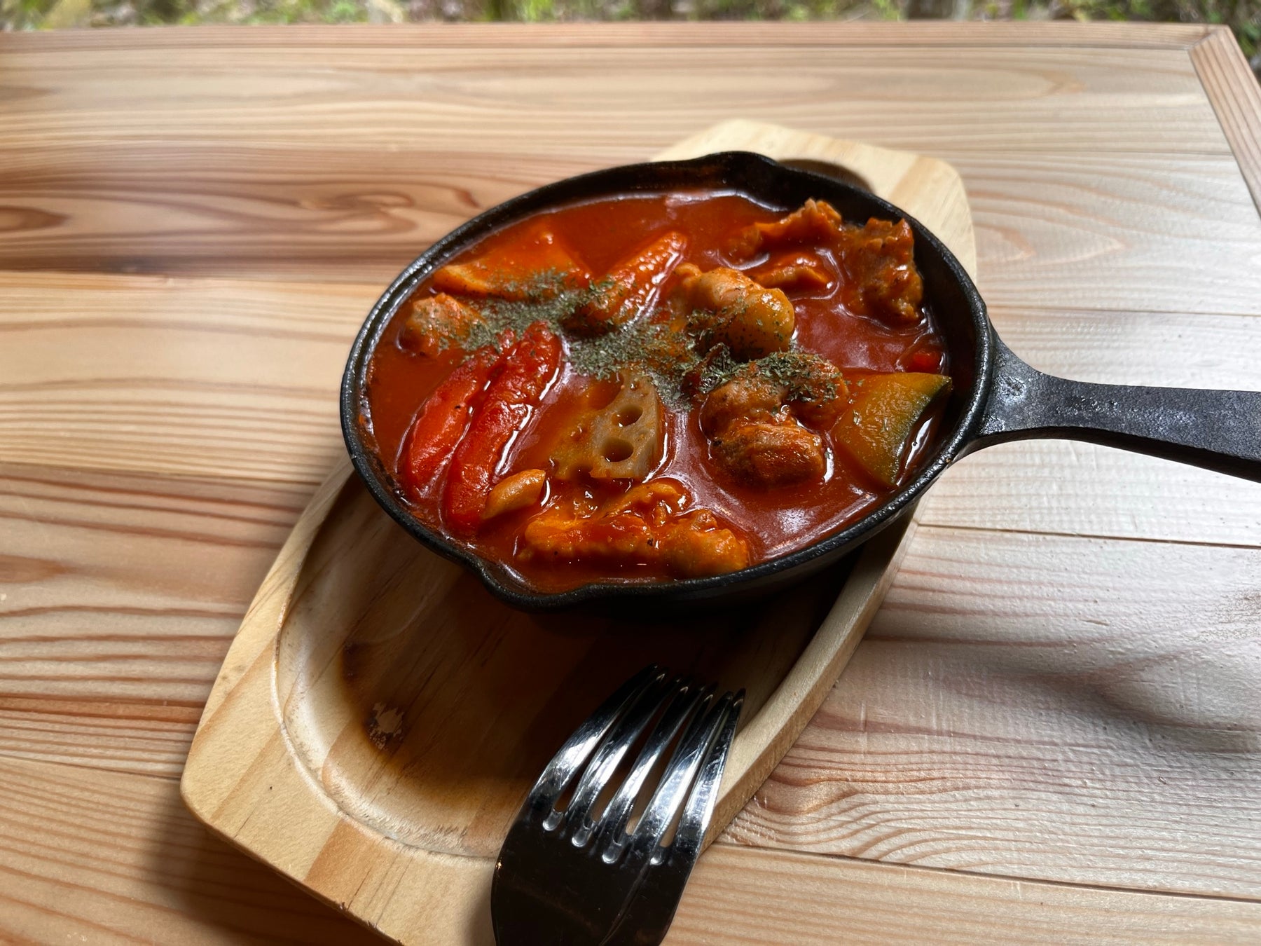 炭火で焼き上げた香ばしい鶏肉とゴロゴロ入った野菜を濃厚なトマトソースで煮込んでいます。