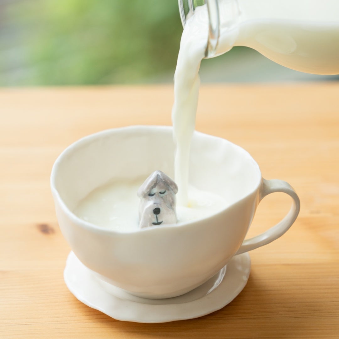 定番の、カップとソーサーのセットです。おじいなテリアのお顔は、目を開けている「ぱっちり」と目を閉じている「すやすや」の2種類。 でも「すやすや」と言っても、にこりの子、スンッの子、むすっとの子、一匹一匹お顔が違います。オンラインショップでも1匹1匹お顔が選べますよ。
