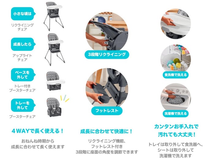 【Point】 プライス」からお子さまのお食事タイムをストレスフリーにする、「お食事用ハイチェア」が 登場! サポート! |