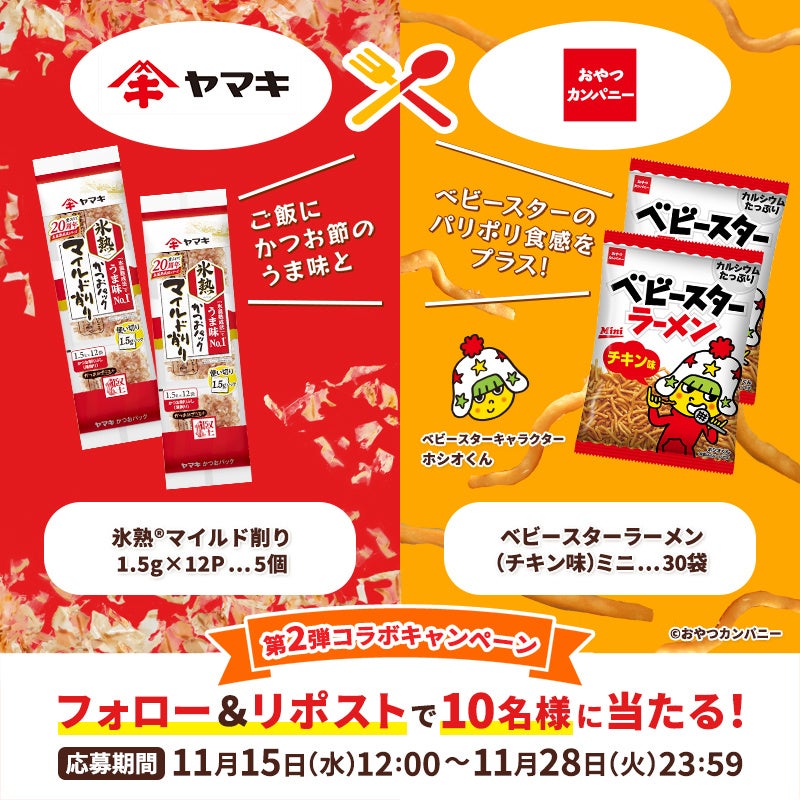かつお節と相性の良いベビースターがタッグを組み、Xコラボキャンペーンを実施します。ヤマキ公式Xアカウントとおやつカンパニー公式Xアカウントをフォローし、該当のキャンペーン投稿をリポスト(旧リツイート)した人の中から抽選で、ヤマキが独自製法で作る「氷熟®マイルド削り」(※)・5袋と、かつお節と相性の良いベビースターラーメン(チキン味)ミニ・30袋をセットにしてプレゼントします。