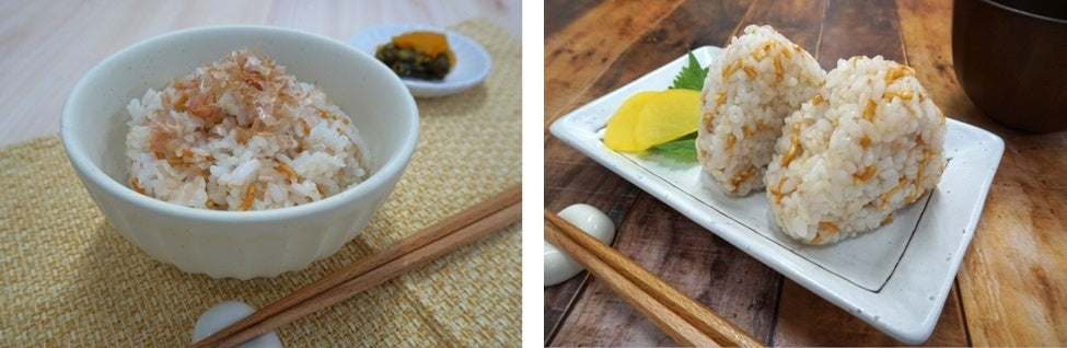 作り方は簡単!ごはんにかつお削りぶし『氷熟®』とベビースターラーメンを入れて混ぜるだけ。使い切りの小分けパックでいつでも新鮮なかつお節のうま味と風味、ベビースターのパリポリ食感がちょい足しされた、混ぜ込みごはんをお楽しみいただけます。冷めても美味しいので、おにぎりにしてお弁当にいれるのもオススメです。