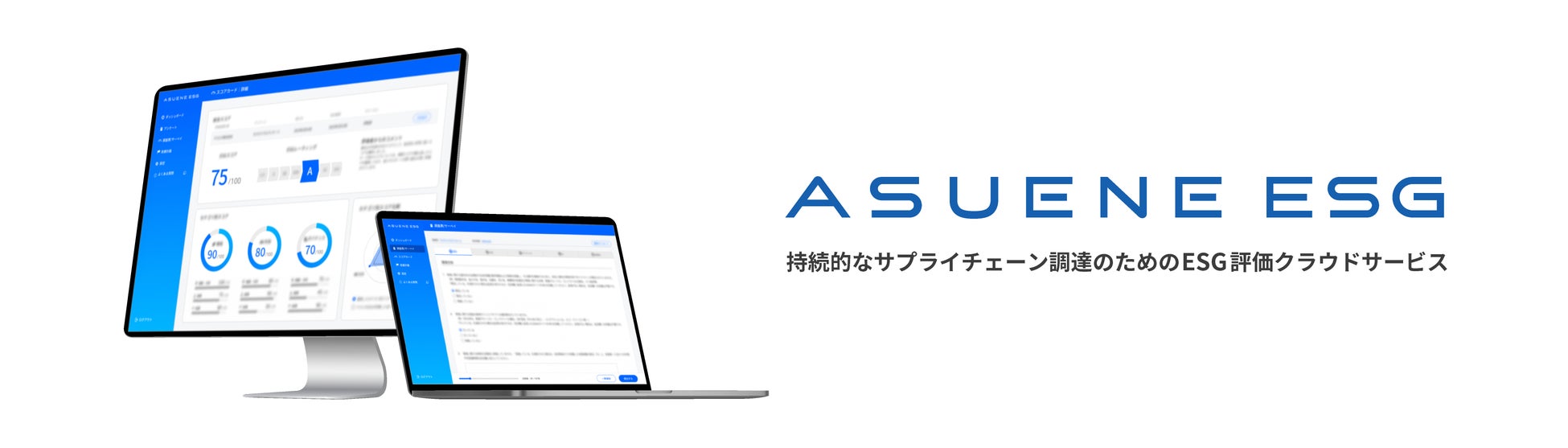 「ASUENE ESG」は、企業のサプライチェーンのESG(E:環境、S:社会、G:ガバナンス)経営の取り組みを可視化できるESG評価プラットフォームです。